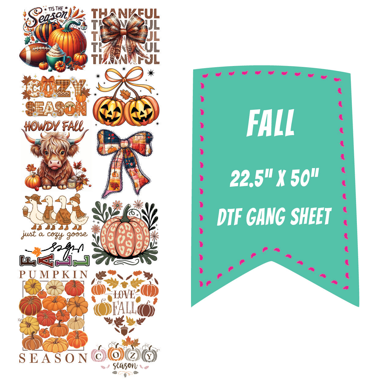 Elevate your seasonal designs with the Fall DTF Gang Sheet measuring 22.5x50". This high-quality transfer sheet allows you to efficiently print multiple fall-themed graphics at once, saving time and boosting productivity. Perfect for creating vibrant, durable prints on various fabrics, it ensures your autumn creations stand out with rich colors and sharp details. Ideal for businesses and crafters aiming to capture the cozy spirit of fall with ease and precision.