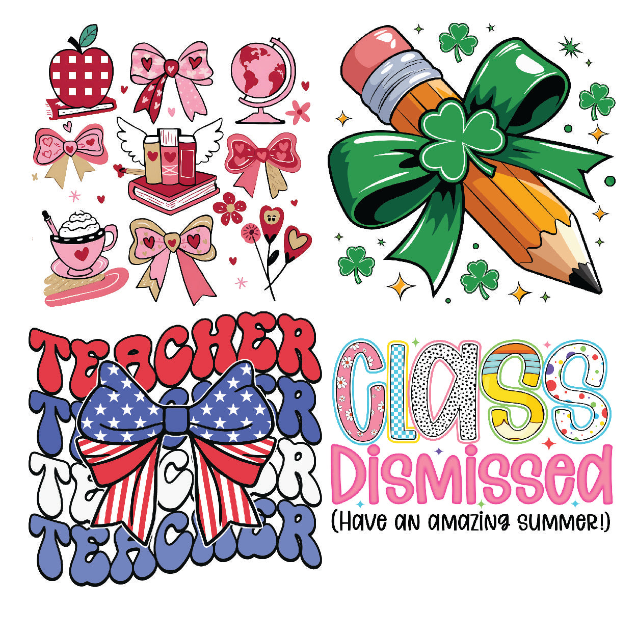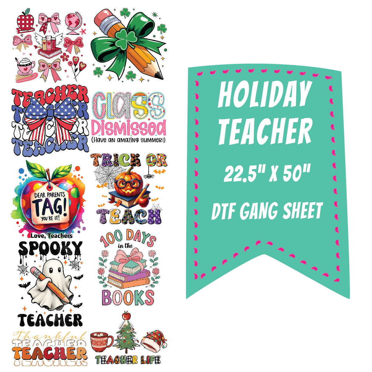 Celebrate the season with the Holiday Teacher DTF Gang Sheet, measuring 22.5x50". Perfect for creating festive, high-quality transfers that bring holiday spirit to any teacher’s wardrobe or gifts. Its generous size allows for multiple designs, making it an efficient choice for crafting personalized, vibrant holiday apparel. Elevate your holiday projects with this versatile and easy-to-use gang sheet designed to impress.