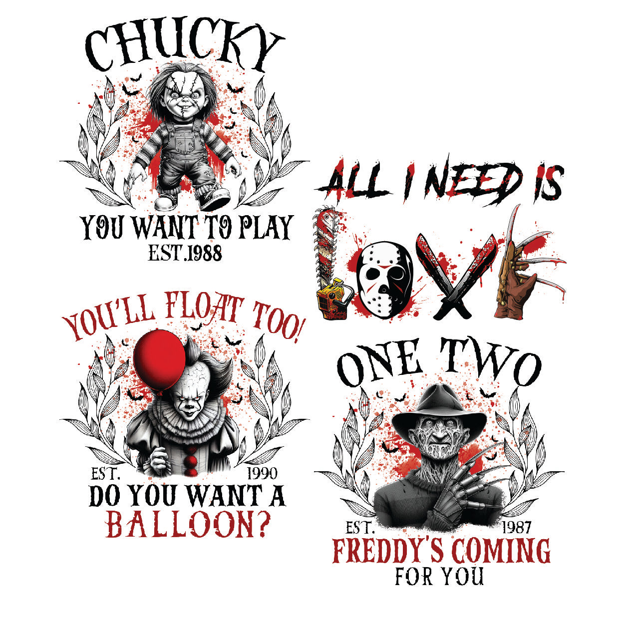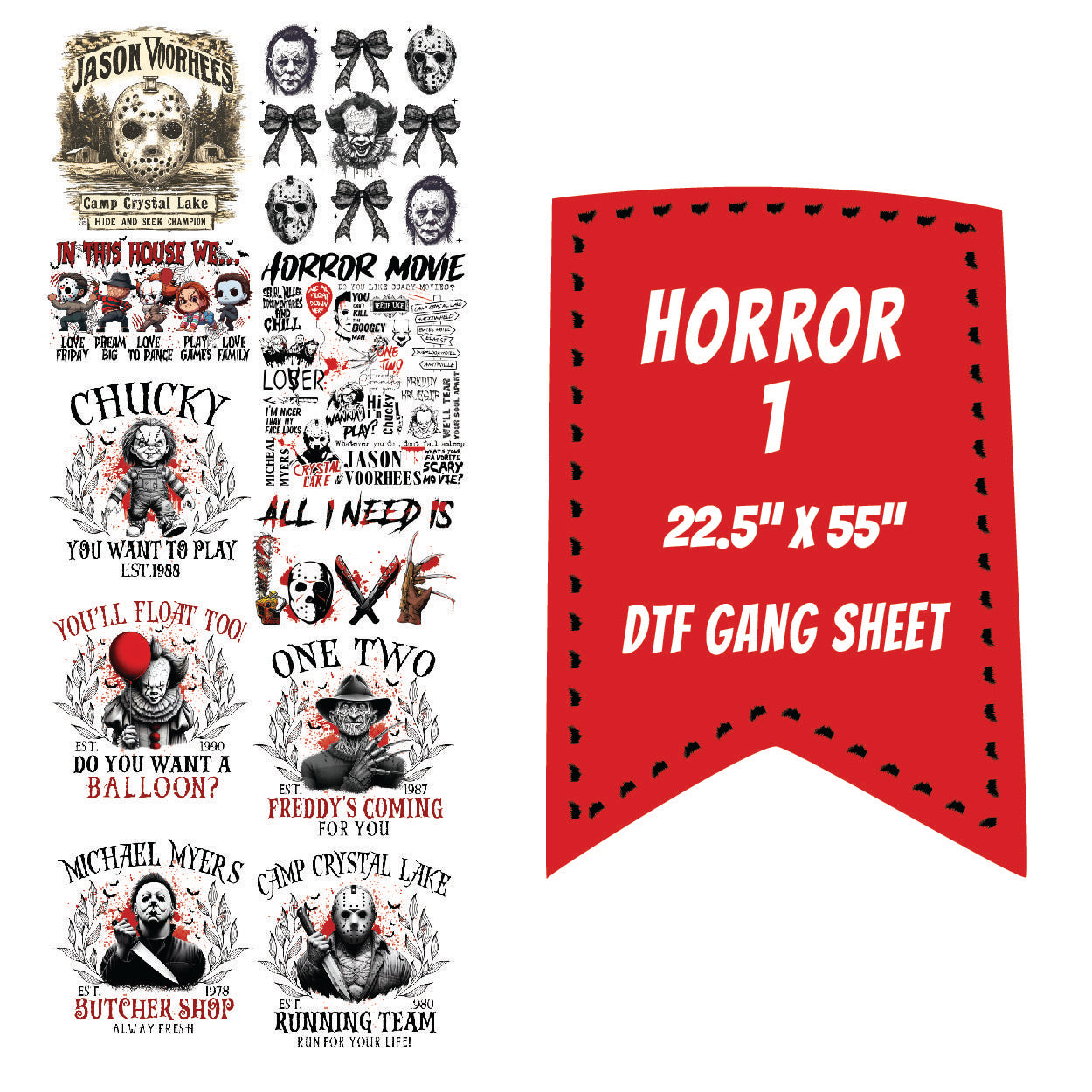 Elevate your custom apparel with the Horror 1 DTF Gang Sheet, measuring 22.5x55 inches. This high-quality direct-to-film transfer sheet delivers sharp, vivid horror-themed designs perfect for creating standout garments. Ideal for small businesses or personal projects, it ensures easy application and durable prints that captivate attention. Transform your creations with this versatile and eye-catching gang sheet today.