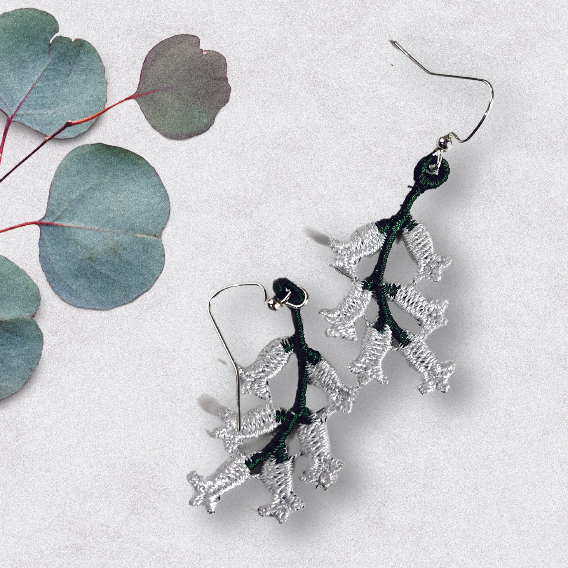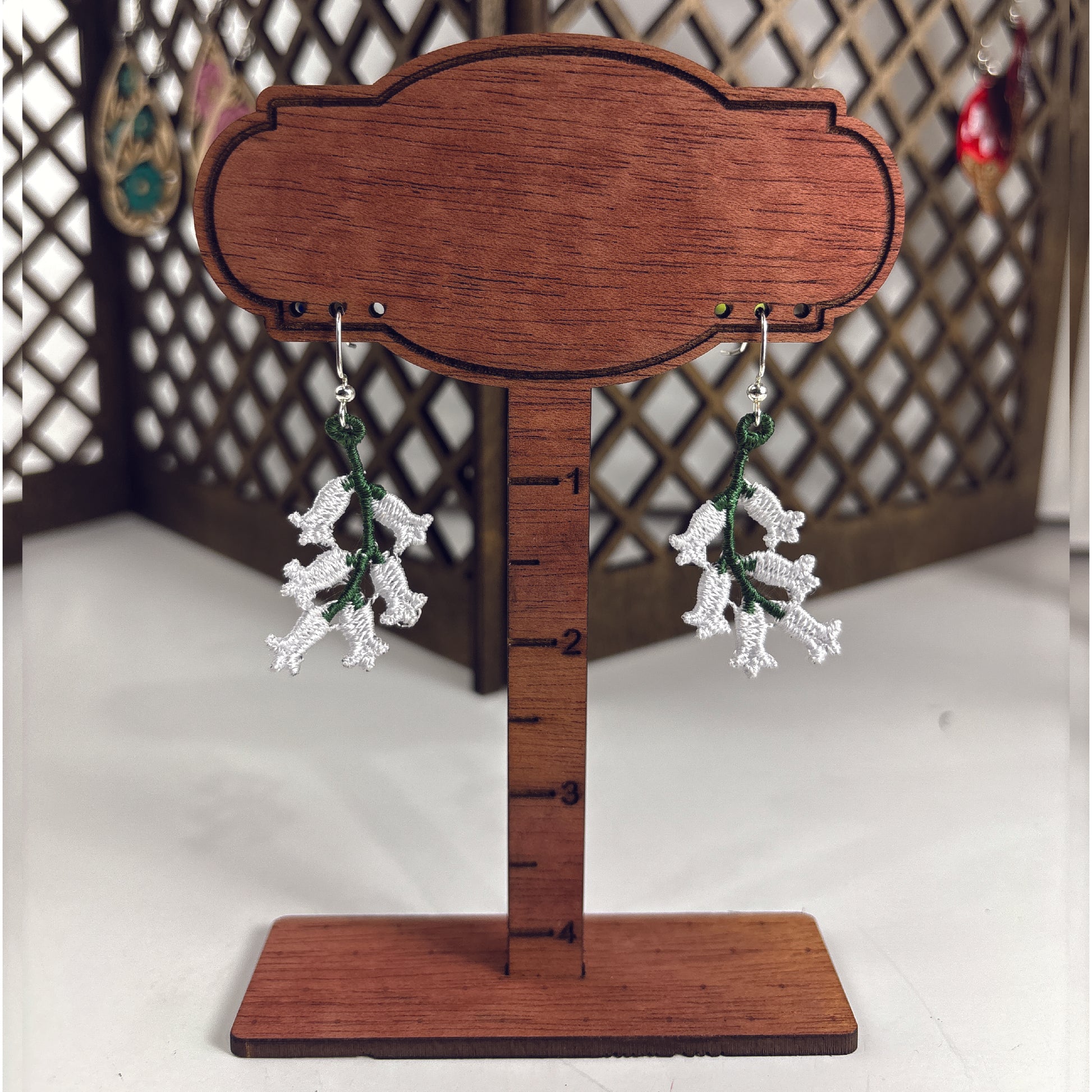 These embroidered Lily of the Valley earrings bring a touch of elegance straight from the garden. Dainty white blossoms hang gracefully from a rich green stem—perfect for nature lovers, fairycore fans, or anyone who loves soft, feminine details with a handcrafted touch.
