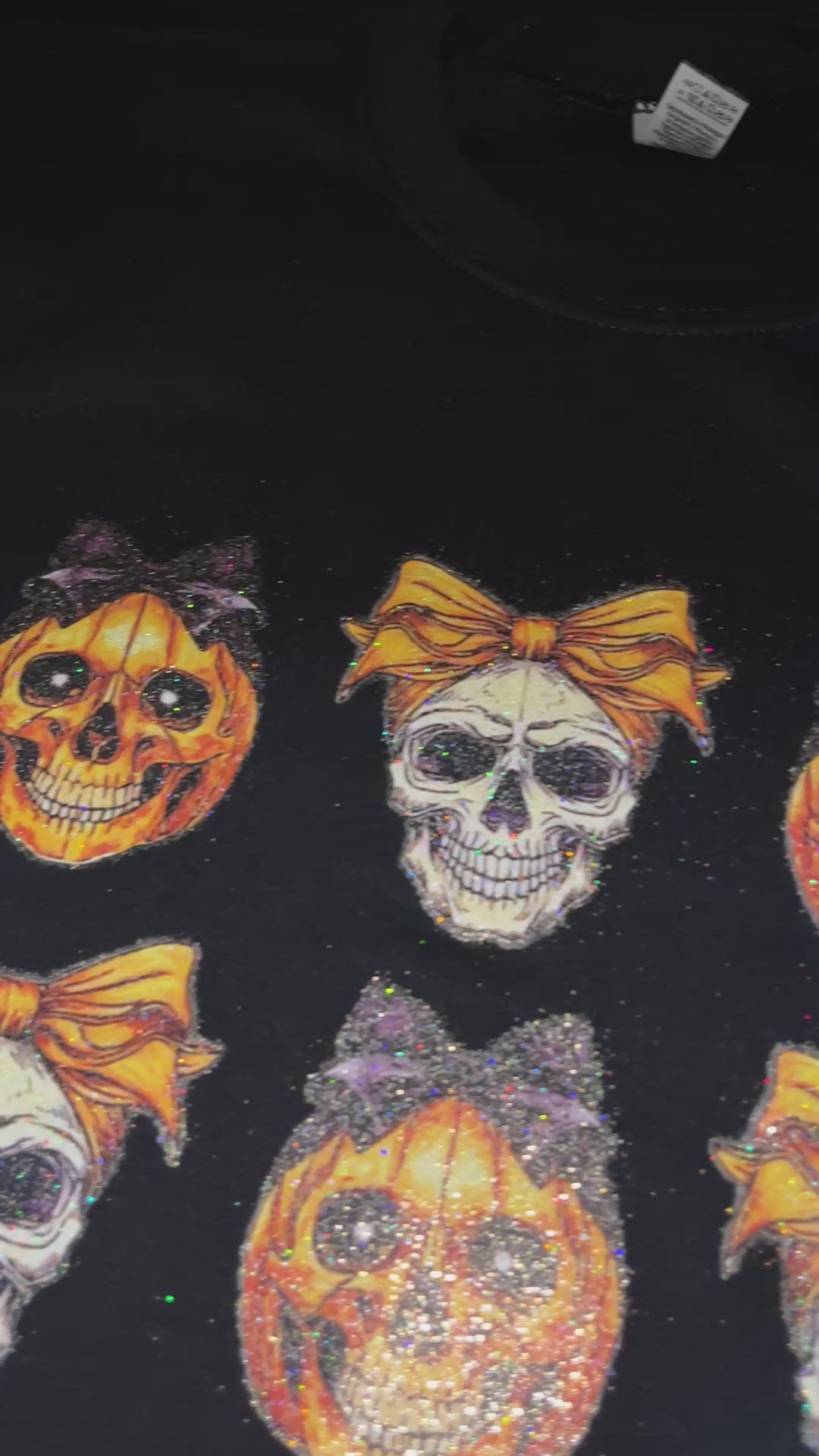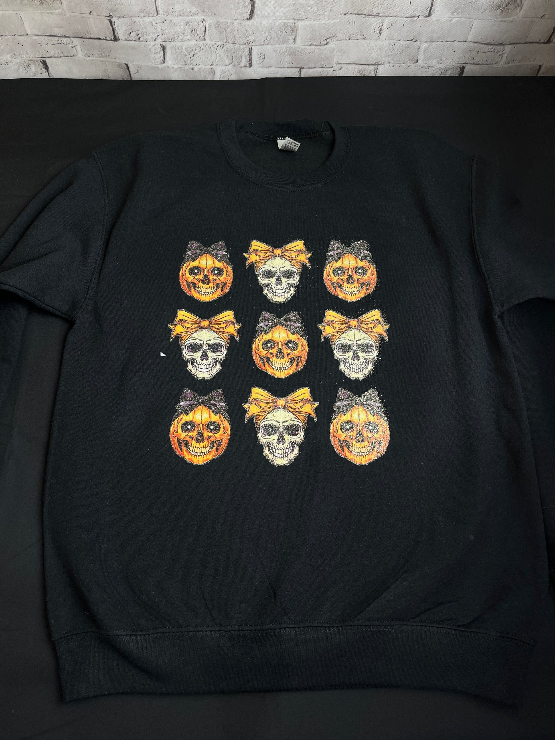 Enjoy festive style at a great value with the Pumpkin and Skulls Glitter Sweatshirt, featuring charming Halloween motifs highlighted by sparkling glitter details. This cozy sweatshirt offers warmth and seasonal spirit, perfect for crisp autumn days. Please note, this item has minor imperfections that do not affect its comfort or overall look, making it a unique find for those who love standout style with a little character. Embrace spooky season with comfort and sparkle while taking advantage of this special offer.