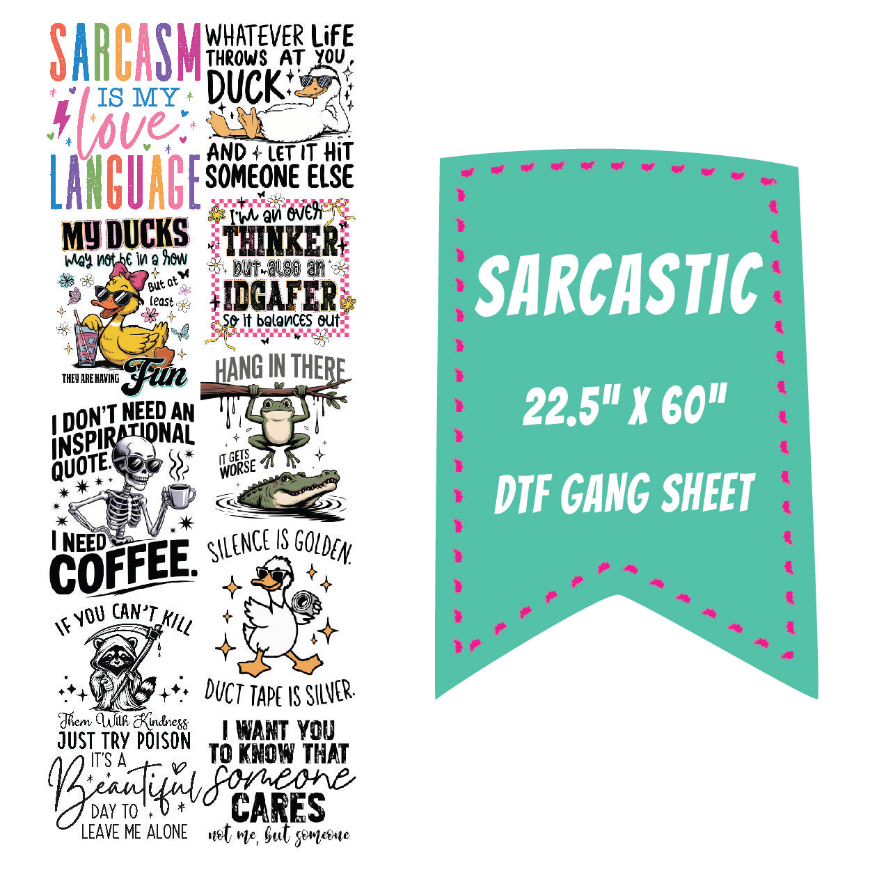 The Sarcastic DTF Gang Sheet measures 22.5x60", providing ample space to create multiple vibrant, detailed transfers at once. Perfect for adding a sharp, witty touch to your apparel, this sheet delivers consistent, high-quality prints that stand out. Streamline your production while making a bold statement with every design—ideal for anyone looking to combine humor and professionalism in their custom creations.