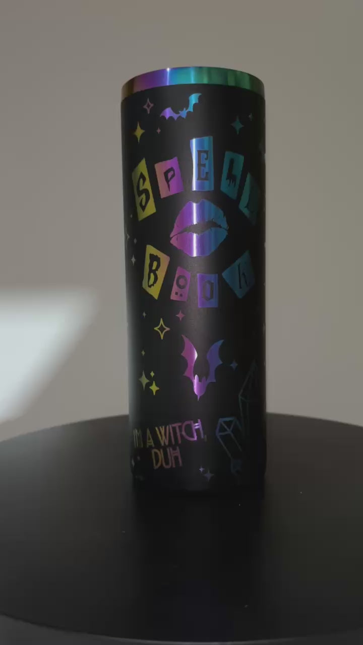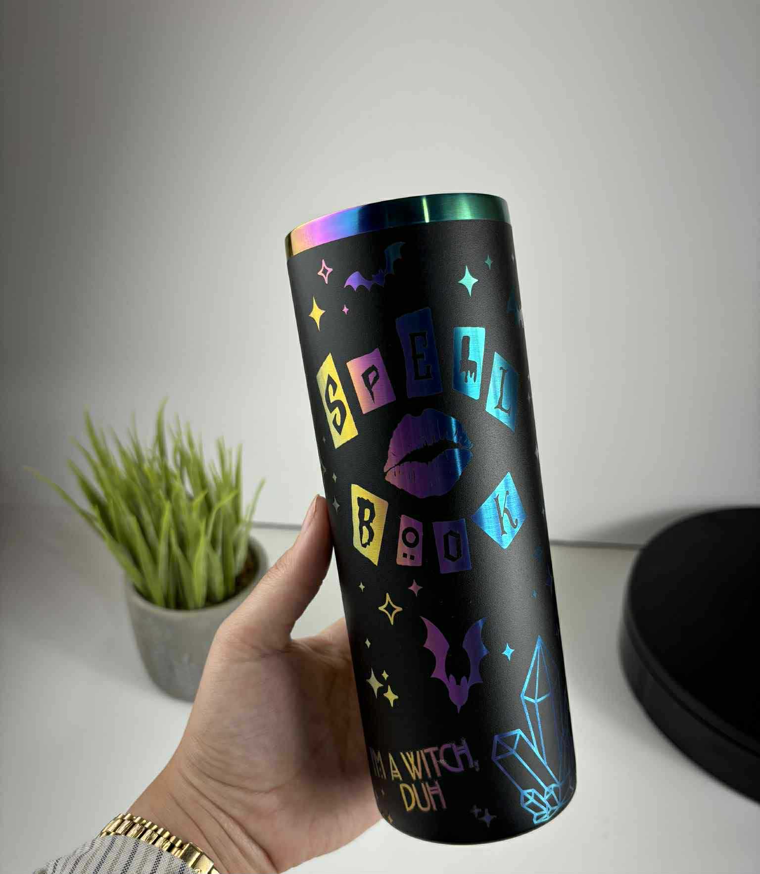 Sip your magic in style with the Spell Book Black/Rainbow 20 oz Tumbler! This enchanting tumbler features a sleek black design accented by vibrant rainbow hues, perfect for adding a splash of color to your day. With a handy straw and generous 20 oz capacity, it’s ideal for keeping your favorite potions—er, drinks—close at hand. Whether you're brewing up coffee or chilling with iced tea, this playful tumbler brings a little spellbinding charm to every sip.