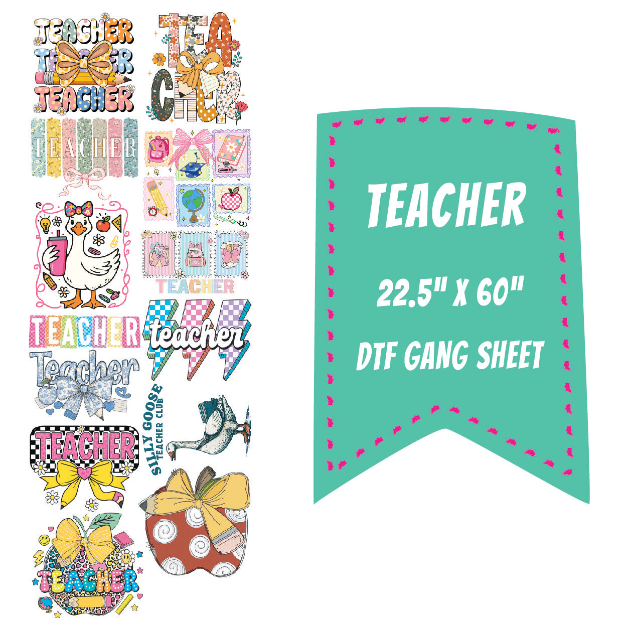 Maximize your printing efficiency with the Teacher DTF Gang Sheet, measuring 22.5x60". Designed to streamline your production, this gang sheet allows multiple designs to be printed simultaneously, saving you time and boosting your output. Perfect for educators and school spirit projects, it ensures vibrant, high-quality transfers that stand out. Elevate your custom apparel game with this essential tool for fast, professional results.